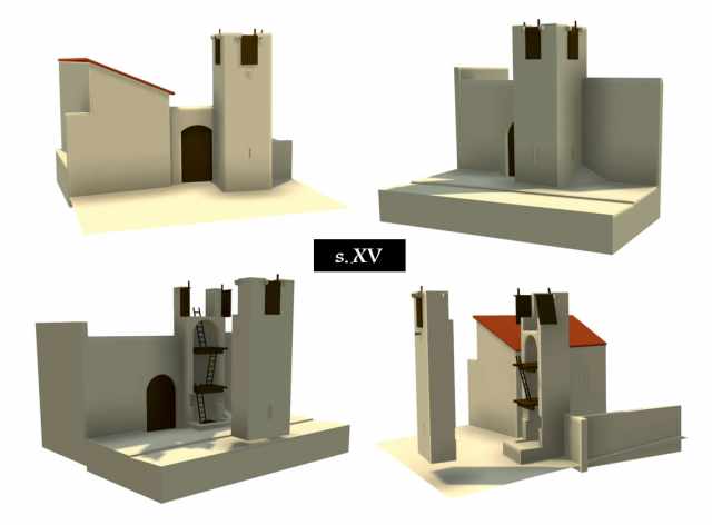 Arran de l’autorització reial de Pere III el Cerimoniós, moltes viles de la corona d’Aragó es començaren a fortificar durant la segona meitat del segle XIV. En aquest mateix període, la tanca que encerclava el convent de Pedralbes i les construccions annexes, terres de conreu i basses més immediates, també va ser reforçada. Aquesta millora consistí en l’addició de, com a mínim, dues torres associades als portals avui afrontats als actuals carrers de Montevideo i del Bisbe Català. La primera conserva bona part de la seva fesomia original, mentre que la segona ha estat molt intervinguda en les restauracions del segle XX. Aquestes torres eren fetes de carreus petris, per bé que l’interior acollia un sistema de forjats i escales de fusta. Ambdues torres presentaven un coronament emmerletat que es podia tancar per mitjà de porticons de fusta penjats de dues mènsules de pedra. Aquestes torres servien per defensar les portes en cas d’atac amb una nova gestió d’accessos que implicava la presència de porters i/o guardes.