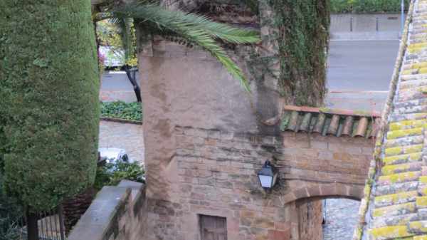 Travessant la porta que hi ha al tram de muralla nord —al carrer de Montevideo—, s’accedeix al camí conegut com a baixada del Monestir. Porta directament a la plaça del Monestir i constituïa, ja en origen, un dels accessos principals al recinte. Al final de la baixada i afrontat a aquesta porta, se situa l’altre accés torrejat del sector sud, al carrer del Bisbe Català.
