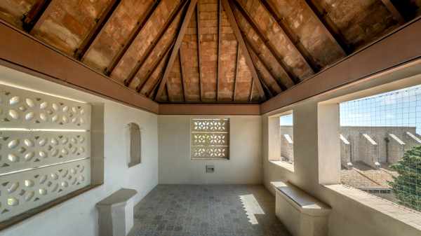 El mirador és un espai rectangular de reduïdes dimensions amb una única obertura quadrada amb gelosia de pedra a cada una de les façanes laterals, a excepció de la façana sud, que s’obre al claustre i actualment té tres finestres de realització contemporània. La fornícula emmarcada per un arc sostingut per dues fines columnes s’inclou dins de la tendència classicista present en l’ornamentació de tot aquest sector. El conjunt està tancat amb una coberta a quatre aigües, de maó i ferro, revestida exteriorment amb teules vidriades blanques pintades de blau.