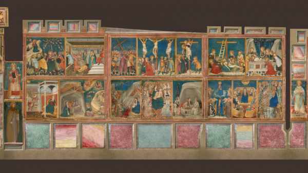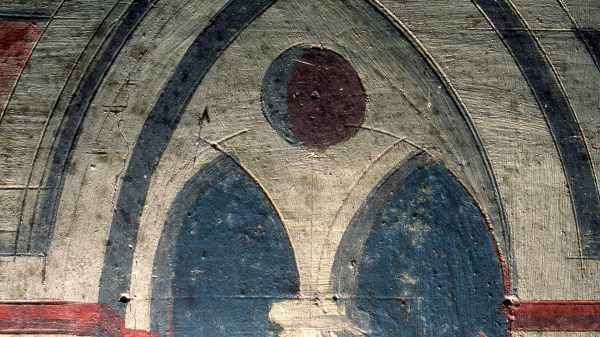 La técnica del compás se empleaba para la preparación de dibujos geométricos y para la obtención de puntos de referencia en la creación de planos horizontales. En la capilla de San Miguel, el compás se ha usado para el diseño de los arcos de las ventanas góticas presentes en los elementos arquitectónicos que enmarcan algunas de las escenas, así como en los nimbos de los personajes.
