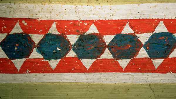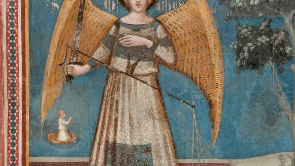 San Miguel pesando las almas, capilla de San Miguel (1346). Pintura mural, técnica mixta de fresco y seco