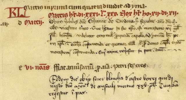 El 28 de febrero de 1325, antes del inicio de la construcción del monasterio, la noble Constança, hija del conde Ramon Folc VI de Cardona y de Flor de Pontiac, hizo una donación testamentaria de 12.000 sous para la construcción de una capilla dedicada a san Pedro y de la sala capitular del monasterio.